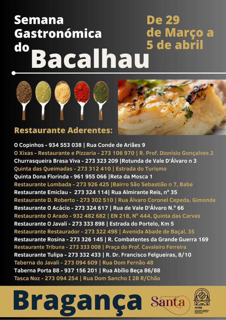 Está de regresso a 𝐒𝐞𝐦𝐚𝐧𝐚 𝐝𝐨 𝐁𝐚𝐜𝐚𝐥𝐡𝐚𝐮 , dinamizada pela Associação Comercial, Industrial e de Serviços de Bragança (ACISB) junto dos restaurantes do concelho, e o “𝐒á𝐛𝐚𝐝𝐨 𝐧𝐚 𝐏𝐫𝐚ç𝐚”, com a exposição e venda de produtos típicos da Páscoa, com destaque para os folares tradicionais. Dois motivos gastronómicos de excelência que convida visitantes e locais a descobrir a 𝐒𝐞𝐦𝐚𝐧𝐚 𝐒𝐚𝐧𝐭𝐚 através de uma experiência sensorial completa e inesquecível. Esta iniciativa é promovida pela Associação Comercial, Industrial e Serviços de Bragança (ACISB), e integra a programação da Semana Santa de Bragança, organizada pela Santa Casa da Misericórdia de Bragança, em parceria com a Unidade Pastoral Senhora das Graças e com o Município de Bragança, que de ano para ano tem vindo a atrair maior número de pessoas, especialmente visitantes oriundos de Espanha.
