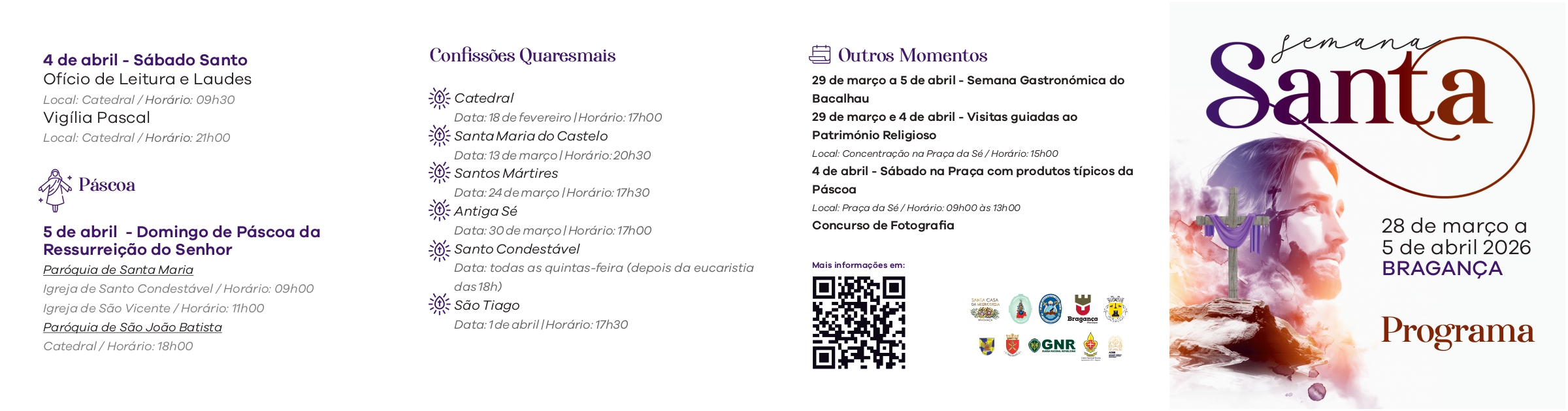 A Semana Santa é, por excelência, o tempo espiritual das Misericórdias. Por isso, a Santa Casa da Misericórdia de Bragança, juntamente com a Unidade Pastoral Senhora das Graças, organiza todos os anos a Semana Santa na cidade de Bragança. Uma tradição que pretende reunir a comunidade numa reflexão espiritual e de fé na celebração da Paixão de Cristo. Uma época vivida na cidade de forma intensa e muito participada, numa prova de vitalidade cristã.